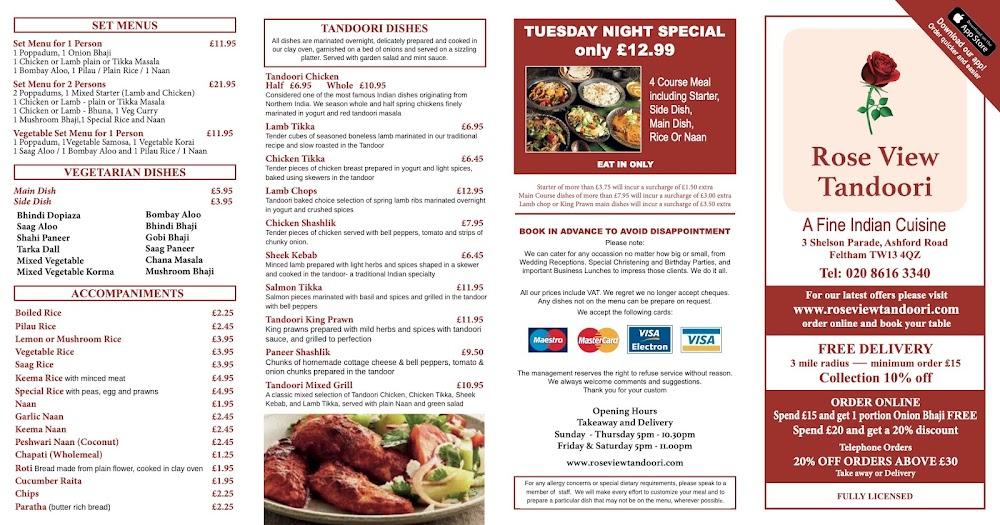 The menu at Rose View Tandoori is impressively diverse, featuring over 140 dishes across a variety of categories. Start with tantalizing appetizers like Aloo Chat and Chicken Tikka before diving into an array of flavorful mains. Notable chef's recommendations include the Chicken Naga and Lamb Rezala, both packed with authentic Indian spices. Their traditional dishes range from creamy Kormas to fragrant Rogan dishes, ensuring that there's something for all spice levels. Biryani lovers can indulge in options like Chicken and Prawn Biryani, all generously portioned. Vegetarian tasters will appreciate the meatless fare, including a delicious Vegetable Biryani. The dessert selection adds a sweet ending to the meal, filled with delightful Indian sweets. Good for sharing or a feast for one, the menu caters to all appetites.